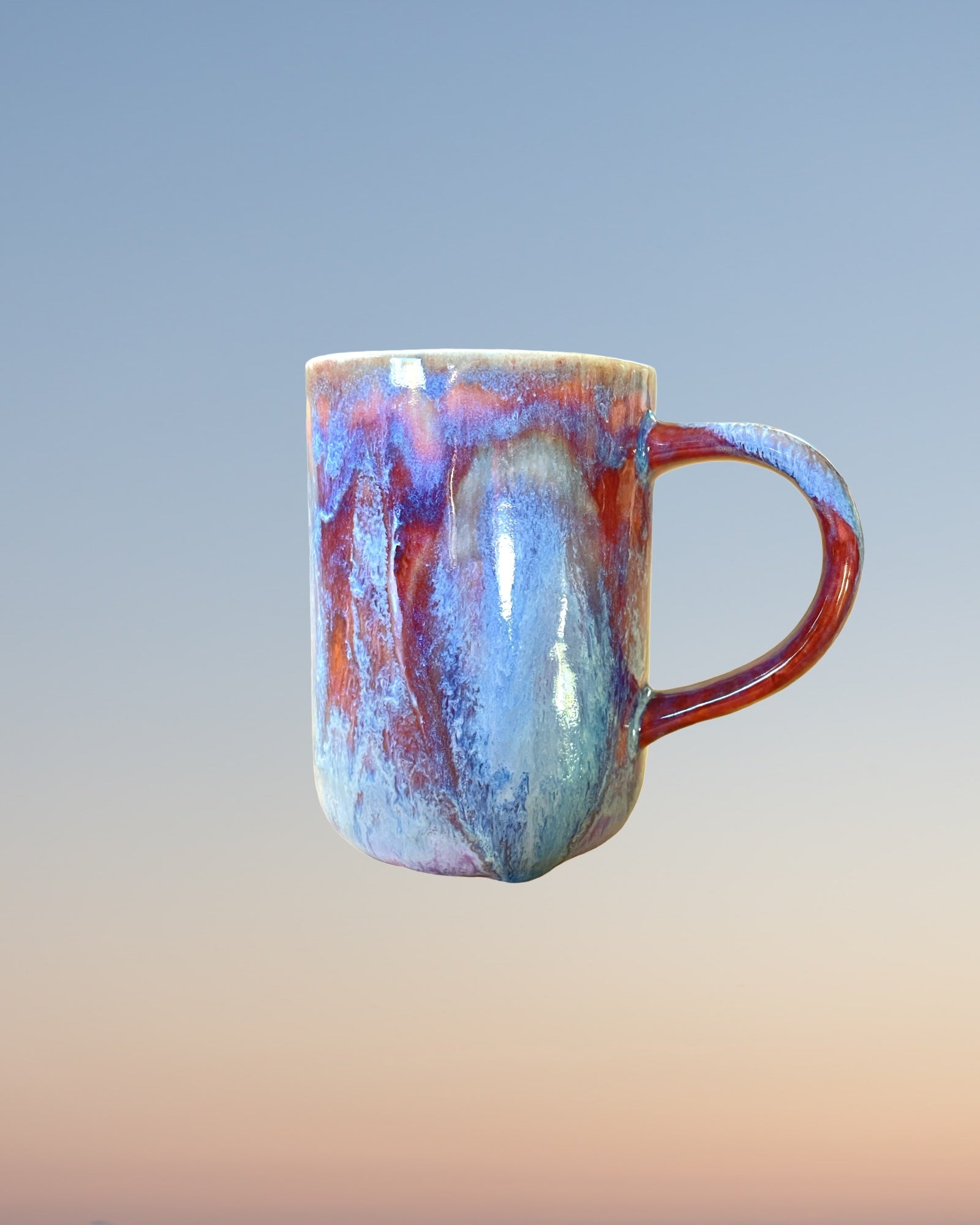 Slip-casted stoneware mug. Hand-painted layered glaze on interior and exterior.